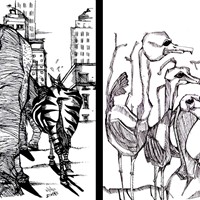 Ink and crayon on paper | Acrylic, ink and watercolor on Bristol board